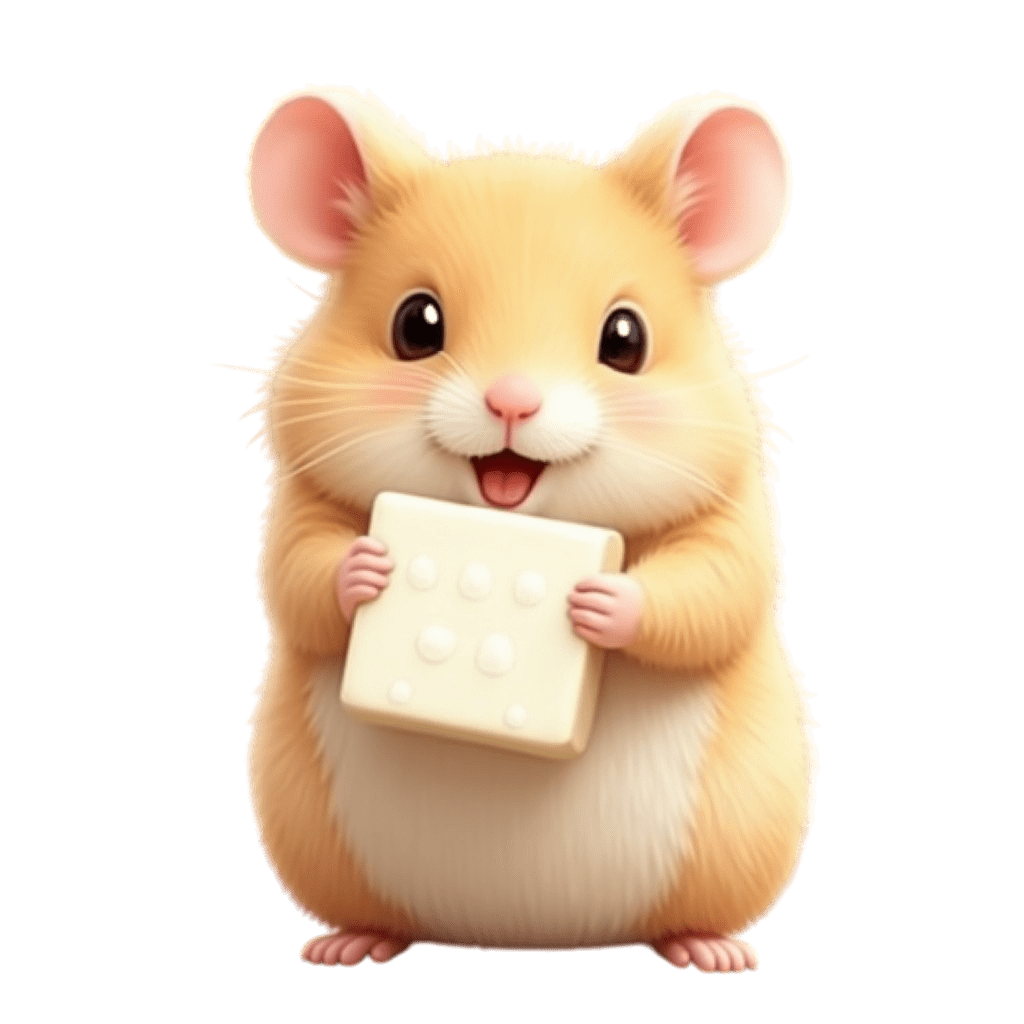 ハムスターが豆腐のおやつを持っている様子。